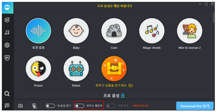 ▼ 설정이 완료된 이후 무료로 제공되는 음성을 선택해주세요. 보이스 체인저를 클릭하셔서 On 상태가 되어야 잘 작동이 되는 변조된 목소리를 들으실 수 있게 됩니다.