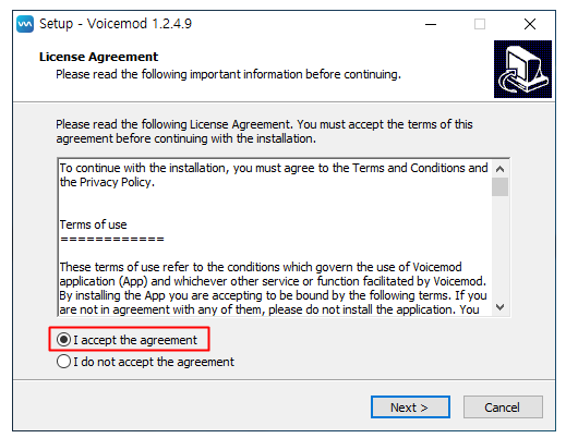▼ VOICEMOD의 설치방법은 간단합니다. License Agreement에 동의 체크해주시고 Next>를 눌러주세요.