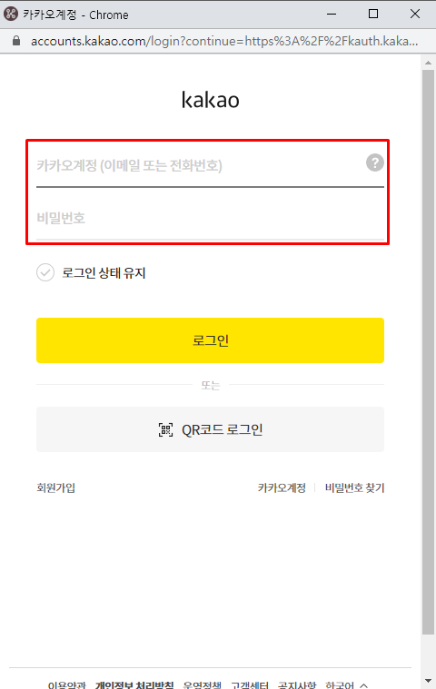 ▼ 모바일에서 이용하시는 [카카오톡] 아이디와 비밀번호 그대로 입력해주시고요.