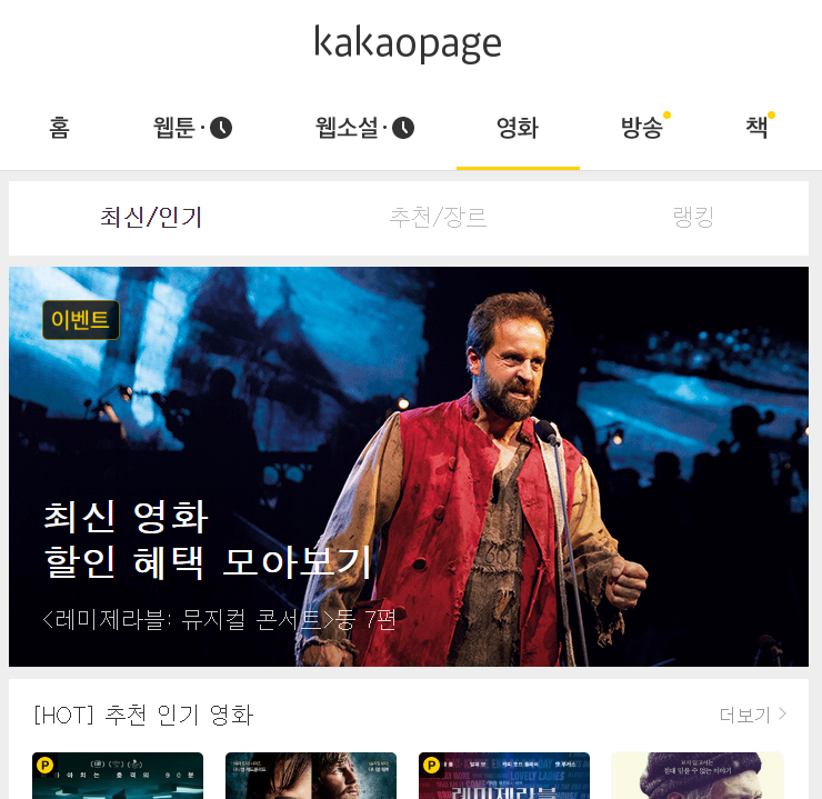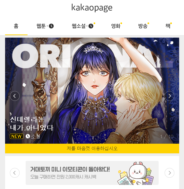 ▼ 카카오페이지 PC 페이지에서도 모바일과 동일하게 웹툰, 웹소설, 영화, 방송, 책 등 모든 서비스를 이용하실 수 있습니다.
