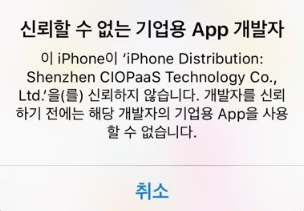 설치가 완료된 어플을 클릭하면 위와 같은 경고 문구가 나오는데요. 이를 해결하기 위해서